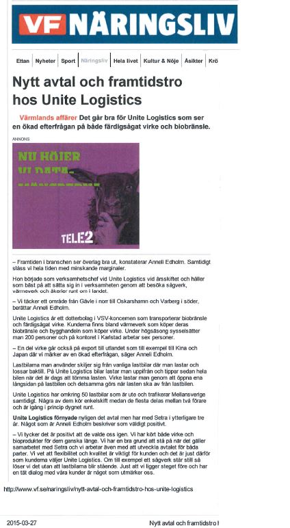 LBC Frakt och VSV Frakt samordnar flistransporter. Tillsammans startar man Unite Logistics som bli störts i Mellansverige på flisrelaterade transporter.